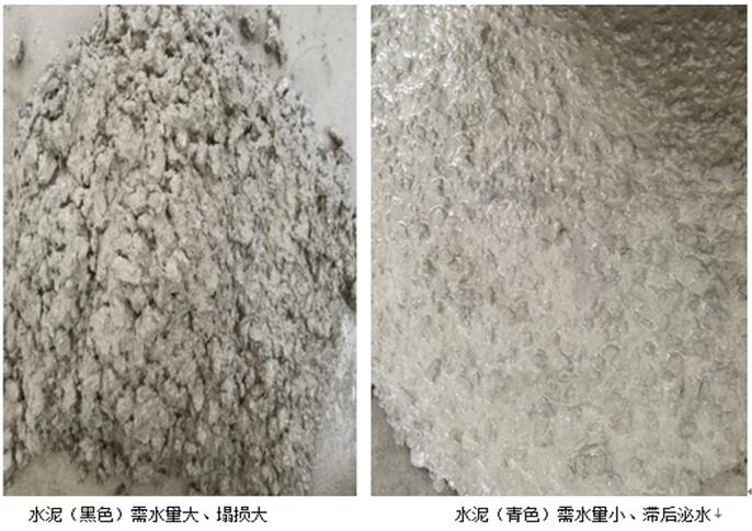 現(xiàn)場使用的是佛山海螺42.5R水泥,經(jīng)過多次試驗,發(fā)現(xiàn)入場不同批次的水泥顏色、細度、化學成分等均有較大差異,水泥溫度也高,每一批次的水泥都有差異,在混凝土中會出現(xiàn)需水量小、泌水、離析與需水量大、干稠、塌損大的矛盾現(xiàn)象,面對此現(xiàn)象,減水劑是很難調(diào)整了讓兩個自相矛盾的水泥可以通用的配方。如下圖所示:同樣減水劑,不同批次水泥的混凝土形態(tài)。