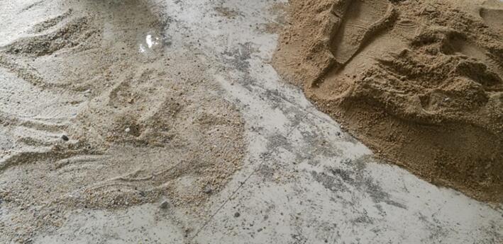 在試驗中,尤其前面做了一次調(diào)試后,形態(tài)良好,發(fā)貨2噸,再次復(fù)盤的時候竟然又出現(xiàn)泌水離析,而此時的水泥沒有發(fā)生明顯變化,最終,發(fā)現(xiàn)砂子的顏色、粗細都有差異。前一條調(diào)試的砂子為偏細、需水量略大的黃沙,而今天換成了偏粗、需水量較小的偏白色砂子,明顯不一樣,導(dǎo)致混凝土形態(tài)發(fā)生變化。如下圖所示: