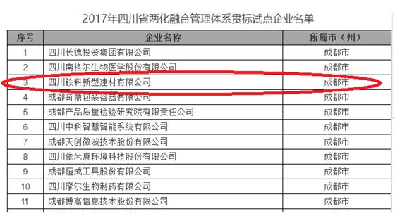 日前,四川鐵科新型建材有限公司被四川省經(jīng)濟(jì)和信息化委員會(huì)評定為2017年四川省兩化融合管理體系貫標(biāo)試點(diǎn)企業(yè),成為全省各行各業(yè)61家貫標(biāo)示范企業(yè)之一。