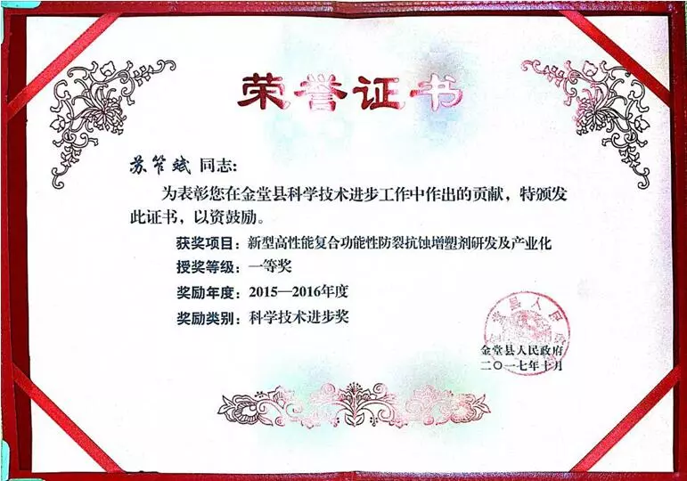 在此次項目中,蘇笮斌先生作為項目負責(zé)人,帶領(lǐng)研發(fā)團隊,經(jīng)過多個日日夜夜的試驗,進行成百上千次的實驗對比,調(diào)配出“新型高性能符合功能性防裂抗蝕增塑劑”。為了鼓勵和表彰蘇笮斌先生在綠色科研,環(huán)保創(chuàng)新上作出的巨大貢獻,金堂縣人民政府還向蘇笮斌先生授予了榮譽證書。