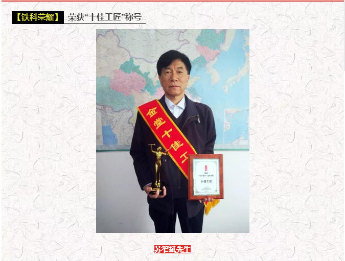 2018年3月28日,金堂首屆“十佳工匠”評選活動頒獎晚會在金堂圓滿落幕。在中共金堂縣委宣傳部、金堂縣人力資源和社會保障局主辦下,經(jīng)過7個月的層層遴選,最終評選出一批用匠心“雕刻”職業(yè),具有工匠精神和精湛技能,助力金堂經(jīng)濟轉型和產(chǎn)業(yè)結構優(yōu)化升級的高技術人才。四川鐵科新型建材有限公司蘇笮斌先生榮獲首屆“十佳工匠”榮譽稱號。