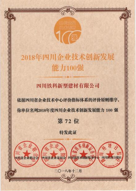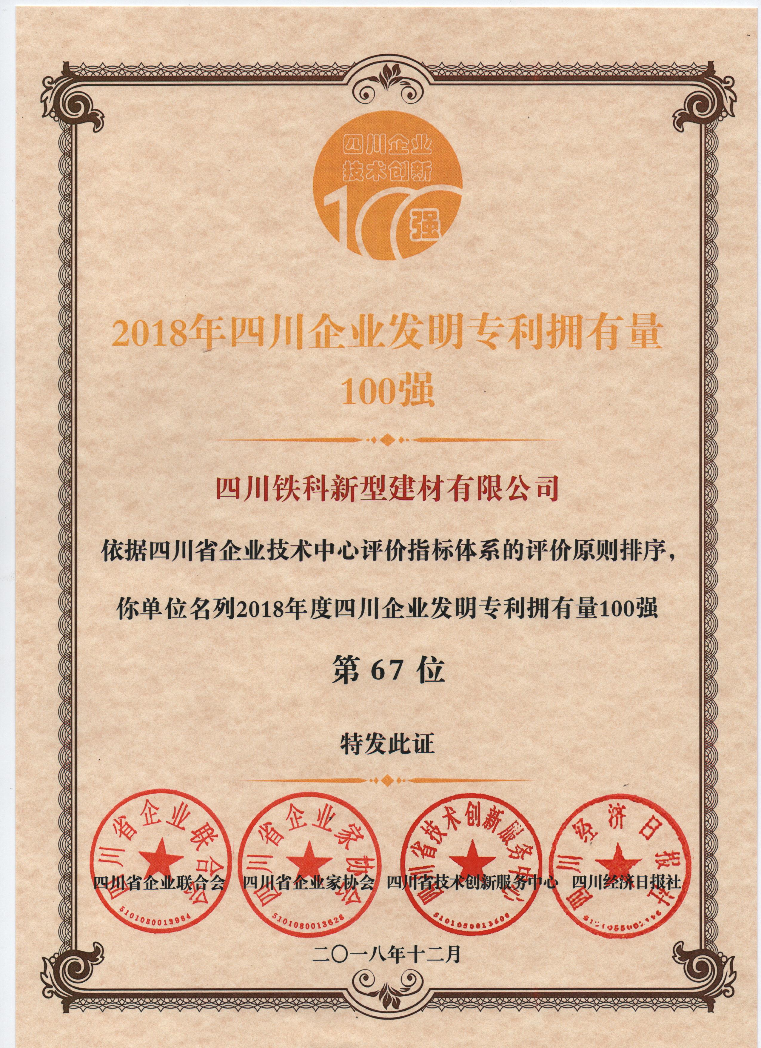 12月12日,省企業(yè)家聯(lián)合會在尊悅豪生酒店舉行了“2018年四川企業(yè)技術(shù)創(chuàng)新發(fā)展能力100強”發(fā)布會。此次發(fā)布會上,四川鐵科新型建材有限公司喜獲3個獎項:“四川企業(yè)技術(shù)創(chuàng)新發(fā)展能力100強“、“四川企業(yè)發(fā)明專利100強“、公司董事長蘇笮斌先生榮獲”四川企業(yè)技術(shù)創(chuàng)新突出貢獻人物“獎。這是我司連續(xù)2年獲此殊榮,彰顯了鐵科集團強勁的技術(shù)創(chuàng)新實力。