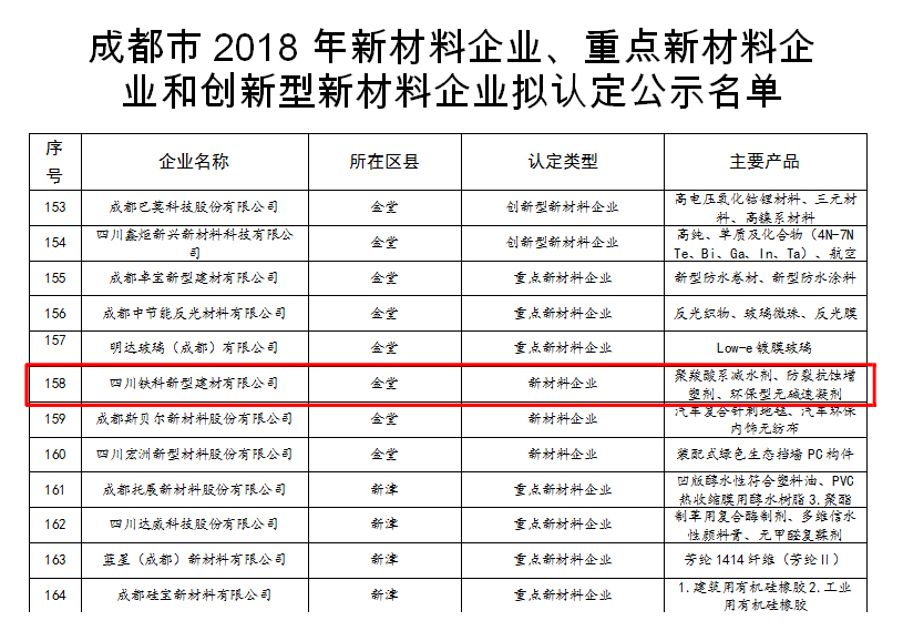 按照成都市經(jīng)濟和信息化委員會《關(guān)于組織開展2018年成都市新材料企業(yè)、重點新材料企業(yè)和創(chuàng)新型新材料企業(yè)認定工作的通知》要求,通過企業(yè)自愿申請、區(qū)(市)縣審核推薦、專家資料評審、現(xiàn)場復核、公示等程序。近日,四川鐵科新型建材有限公司獲得《成都市新材料企業(yè)》認定。