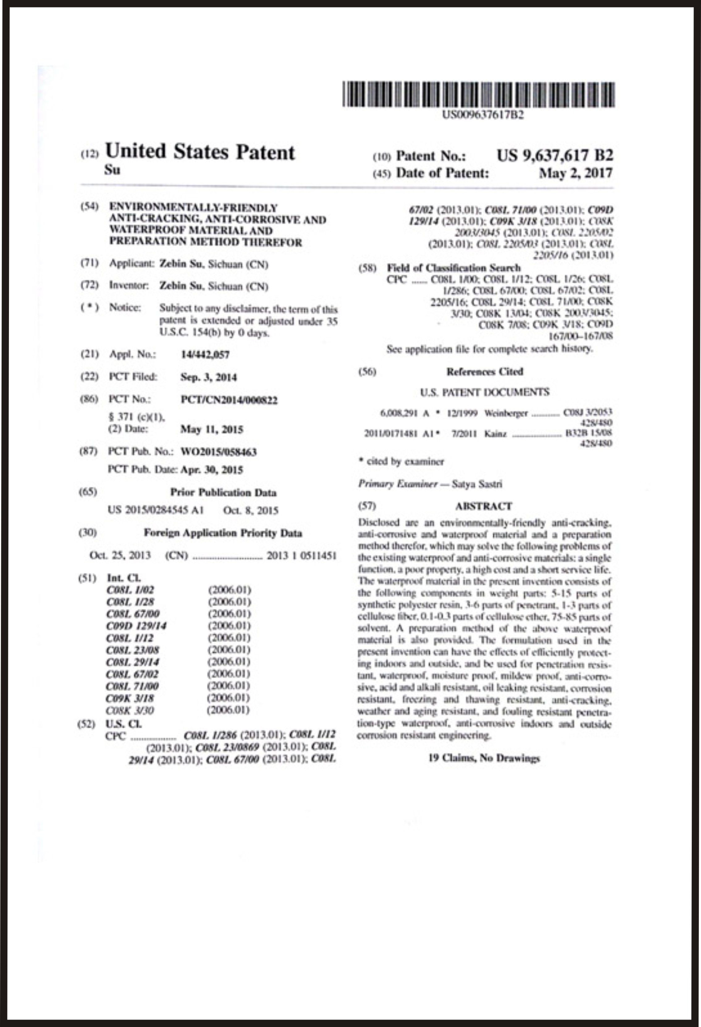 近日,四川鐵科新型建材有限公司的一項(xiàng)發(fā)明專利獲得美國國家知識(shí)產(chǎn)權(quán)局授權(quán),此專利名稱“一種環(huán)保型防裂抗蝕防水材料及其制備方式”,專利號(hào)為:US9637617B2