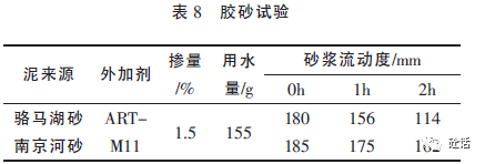 從表8可以看出,摻加駱馬湖砂中的泥,膠砂初始流動度為180mm,1h后流動度為156mm,2h后流動度為114mm;摻加南京河砂中的泥,膠砂初始流動度為185mm,1h后流動度為175mm,2h后流動度為162mm,由本組對比試驗可以得出摻加同樣當(dāng)量的泥含量,駱馬湖砂中泥對外加劑的吸附更大。
