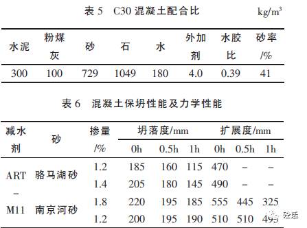 (1)測試了駱馬湖砂和南京河砂在同樣外加劑摻量下的混凝土坍落度保持性能,采用南京河砂,混凝土坍落度保持能力強(qiáng),1h損失10mm;采用駱馬湖砂,混凝土坍落度1h損失70mm。