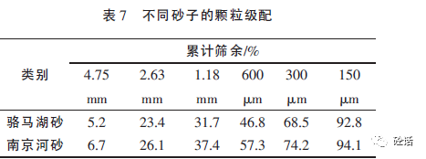 通過累計篩余,計算出駱馬湖砂的細(xì)度模數(shù)為2.5,南京河砂的細(xì)度模數(shù)為2.7,從砂子的顆粒級配和細(xì)度模數(shù)角度分析,駱馬湖砂和南京河砂相比略微偏細(xì)。