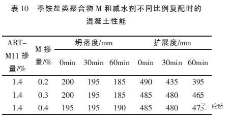對于季銨鹽類低聚物,參考魯紅升[11]等人的文獻(xiàn)報道合成得到,產(chǎn)品編號為M,采用和上組試驗同樣的原材料及配合比,分別試驗了減水劑摻量為1.4%時,不同季銨鹽類聚合物摻量下的預(yù)拌混凝土性能,結(jié)果見表10。