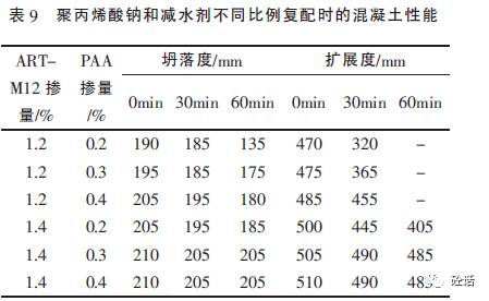 基于前期的研究,本文選用分子量為5000的聚丙烯酸鈉(PAA)作為抗泥功能助劑,對不同摻量下的混凝土性能進(jìn)行了試驗,測試結(jié)果見表9。