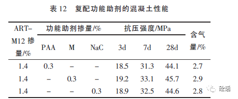 進(jìn)一步測試了減水劑摻量為膠材用量的1.4%,聚丙烯酸鈉、季銨鹽類低聚物M和腐殖酸鈉(NaC)摻量為0.3%時的混凝土抗壓強(qiáng)度及含氣量,測試結(jié)果見表12。