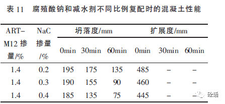 腐殖酸鈉(NaC)含有較多的羥基、醌基、鄰位雙酚羥基、羧基等可與黏土吸附的官能團(tuán),同時具有很大的內(nèi)表面積,使其對黏土具有較強(qiáng)的吸附作用,本文同樣試驗不同腐殖酸鈉摻量下拌合混凝土的性能。采用的原材料及配合比和上組試驗相同,試驗結(jié)果見表11。