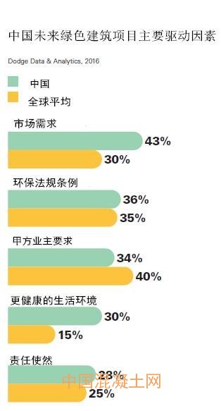 驅(qū)動:市場需求是中國未來綠色建筑項目最廣為認(rèn)知的驅(qū)動因素。然而,除了市場本身的拉動性需求外,環(huán)保法規(guī)條例也是中國市場的一個關(guān)鍵推動力。中國市場的主要驅(qū)動因素跟全球市場的驅(qū)動因素間的區(qū)別在于兩者對更健康生活環(huán)境的重要性的認(rèn)知。在中國,認(rèn)為生活環(huán)境健康更重要的中國被訪企業(yè)高達(dá)30%,而這一數(shù)字的全球平均數(shù)只有15%。