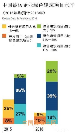 中國仍是一個新興發(fā)展的綠色建筑市場33%的中國被訪者目前的施工建筑中少于16%的為綠色項目,僅有5%的中國被訪者所實施的綠色建筑項目占比大于60%。盡管如此,三年后,中國建筑企業(yè)或?qū)⒋蟠筇岣呔G色建筑的參與度。僅5%的建筑企業(yè)將實施15%以下是綠色項目,而那些計劃實施大多數(shù)項目(占比60%以上)為綠色建筑的企業(yè)數(shù)將增大五倍至28%。