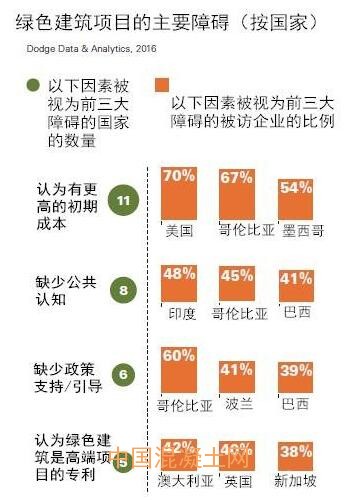 此報告提到,13個國家中有11個都認(rèn)為更高的初期成本是綠色建筑發(fā)展的前三大障礙,這在美國和哥倫比亞地區(qū)尤為突出。在巴西、哥倫比亞、印度和波蘭等很多發(fā)展中的市場,缺少公共認(rèn)知以及政策支持是最主要的發(fā)展障礙。比起在發(fā)展中的市場,在澳大利亞和英國等更多的發(fā)達(dá)市場,綠色建筑被定義為高端項目的專利是一個更加顯著的障礙。