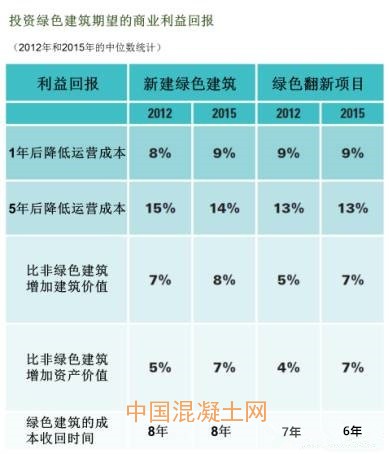 所有中國被訪建筑企業(yè)都表示已經(jīng)設(shè)立了追蹤其綠色建筑項目效益的指標(biāo)。然而,新建樓宇和翻新項目在一年內(nèi)降低的運(yùn)營成本僅為4%,這一數(shù)值相對全球9%的降低量來說尚屬保守。但是,中國較低的施工成本帶來了比全球平均更短的投資回收期,這一結(jié)果大大鼓勵了綠色建筑的進(jìn)一步投資。