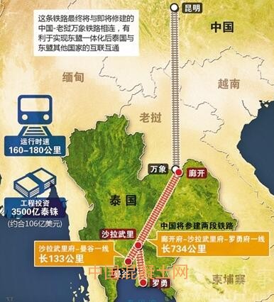 2015-06-26新聞“泰國副總理稱中方將在泰修建中速鐵路”報道:泰國副總理帕蒂亞通稱,放棄高鐵方案,聯(lián)合修建首都曼谷至廊開873公里的中速鐵路(即快速鐵路),該路線的設(shè)計時速為160-180公里。