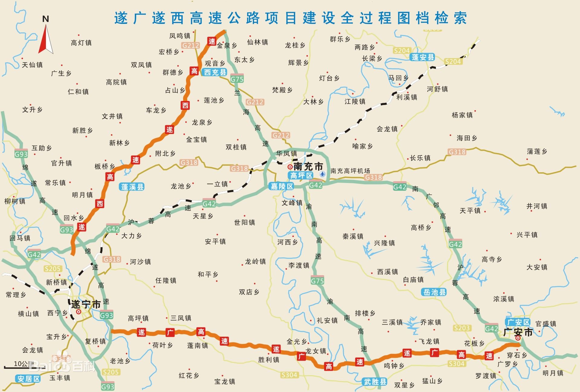 遂西高速公路起于遂寧市蓬溪縣吉祥鎮(zhèn)涪山壩,順接遂寧市規(guī)劃的城市道路。在西充境內(nèi)進(jìn)入車龍、經(jīng)占山鄉(xiāng),設(shè)置西充互通;經(jīng)常林、復(fù)安、關(guān)文,止于太平鎮(zhèn)賈家灣,設(shè)置太平樞紐互通,與廣南高速公路相接。